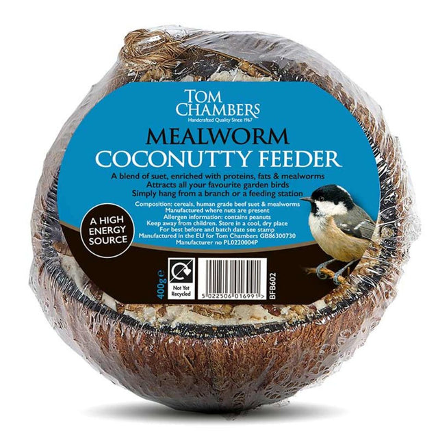 The Tom Chambers Whole Mealworm Coconutty Feeder offers a natural and nutritious way to attract wild birds to your garden. This authentic whole coconut shell is filled with a rich blend of human-grade beef suet, cereals, seeds, and dried mealworms, providing a balanced and energy-dense food source that supports birds throughout the seasons.