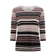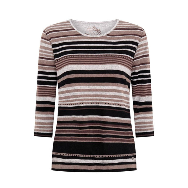 Part of Tigi’s LAND Collection, this brown striped top is designed to blend everyday comfort with refined elegance. The soft, stretchy polyester-elastane fabric provides a smooth fit that moves with you, while the horizontal stripes in taupe, black, and cream create a flattering, balanced silhouette. Subtle diamante accents across the chest and hemline add a touch of understated glamour, making this top ideal for both casual outings and dressier occasions.