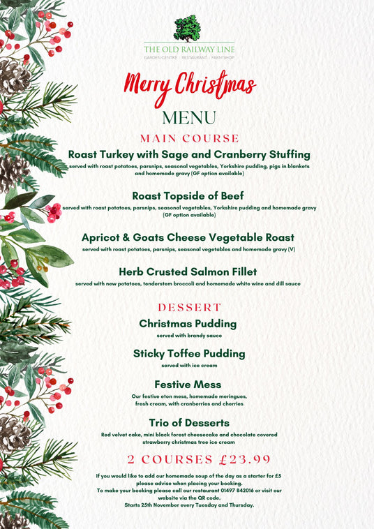 Welcome to the Railway Restaurant's Christmas Menu Booking Page! Join us in celebrating the season of joy with a scrumptious two-course Christmas menu, ideal for gathering with your loved ones and colleagues. Reserve your table today and savour the magic of Christmas at the Railway Restaurant.