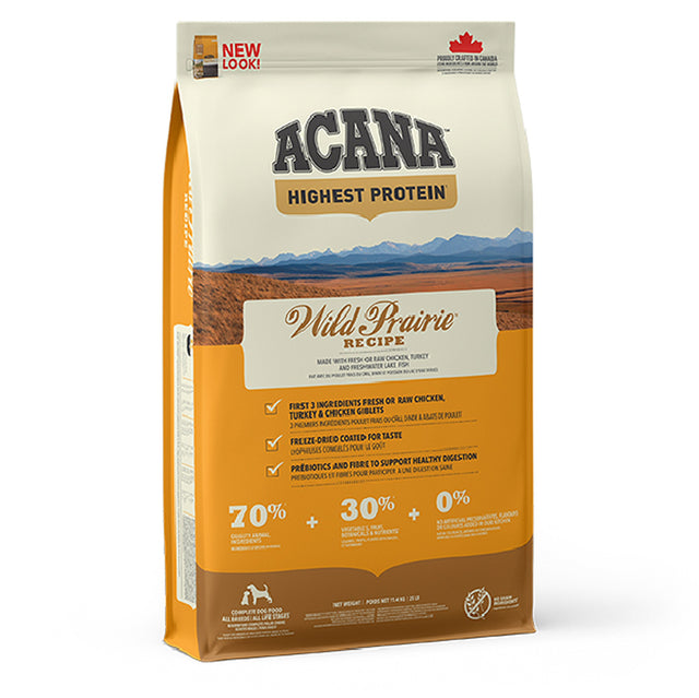 Every ACANA® recipe is thoughtfully crafted from start to finish with premium ingredients. With the highest protein offering in ACANA pet foods, ACANA Highest Protein Wild Prairie® Recipe is rich with 70% quality animal ingredients like free-run chicken and turkey, wild-caught and sustainably farmed fish, balanced with 30% fruits, vegetables, and botanicals, delivered daily.