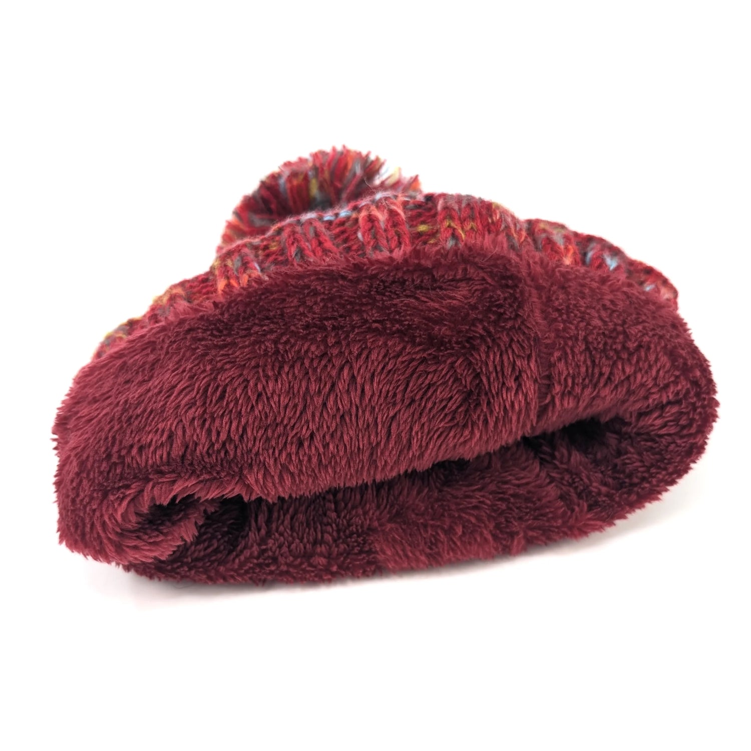 Mottled pompom hat with big matching wool pompom. Fully lined. Warm red. Adult size. Great for autumn and winter.