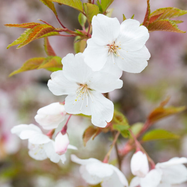 A stunning ornamental cherry, Prunus 'The Bride' is a compact tree that bursts into large, single white blossoms in early spring, each featuring striking red anthers. With bronze-green spring foliage that matures to lush green in summer, followed by vibrant autumn colours in shades of orange, red, and purple, this tree provides year-round interest.