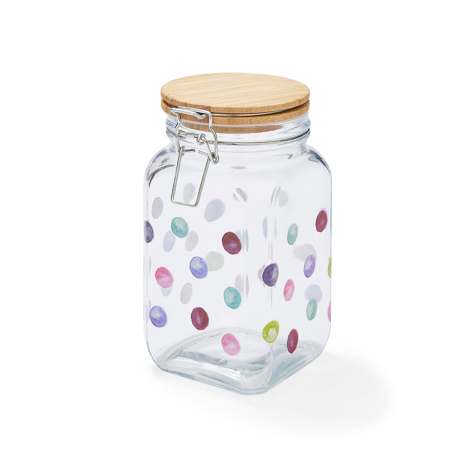 This Cooksmart glass jar comes with a bamboo clip top lid for secure storage. Keep your pantry organized and add a touch of style with the playful Spotty Dotty design. Made with high-quality materials, it's durable and functional. Perfect for storing dry goods and bringing a modern touch to your kitchen.