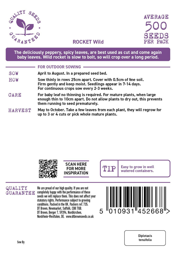 Enhance your garden with the peppery flavour of D.T. Brown Wild Rocket Seeds. This robust and hardy leafy green is known for its distinct taste and nutritional benefits, making it a perfect addition to salads, sandwiches, and garnishes. Wild rocket adds a delightful kick to your culinary creations and is easy to grow in various conditions.