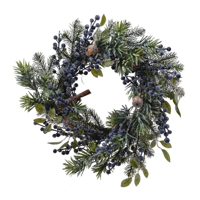 40cm diameter, 11cm height wreath with frosted blue berries, cinnamon sticks, nuts, and willow