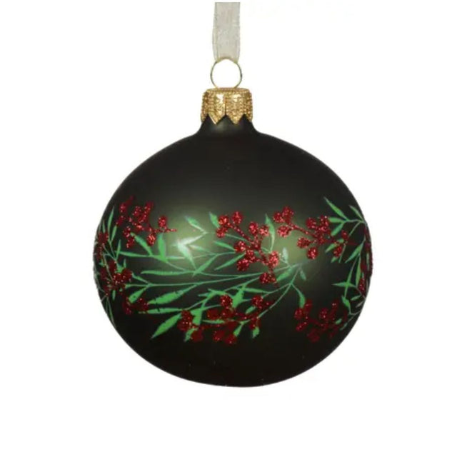 Decoris 8cm Pine Green Matte Glass Bauble with Berries