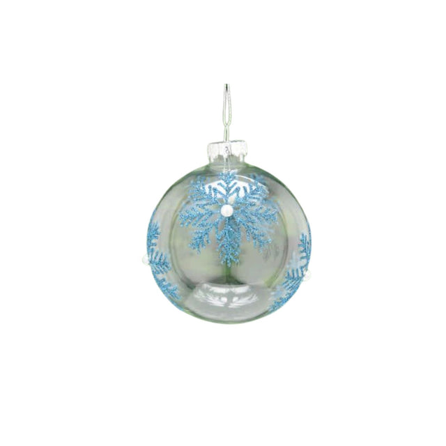 • Transparent clear glass showcases intricate blue glitter snowflake design