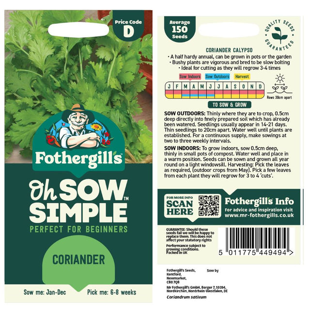 Fothergills Oh Sow Simple Calypso Coriander is the perfect herb for adding fresh, fragrant flavour to your cooking. Whether you're a beginner or an experienced gardener, it's an easy, quick-growing addition to your garden or kitchen windowsill.