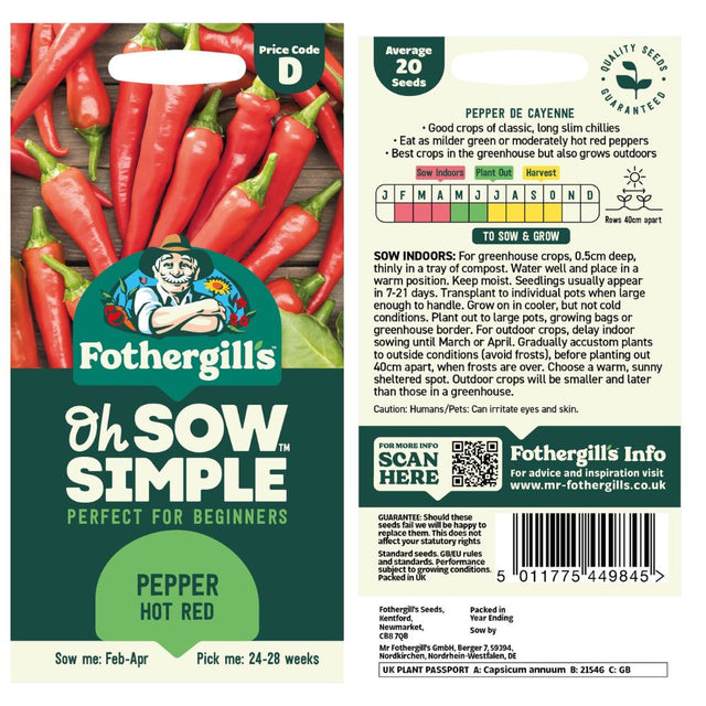 Fothergills Oh Sow Simple Hot Red Pepper brings a spicy twist to your garden and your kitchen. Perfect for beginners and seasoned growers alike, these vibrant chillies will add colour, heat, and excitement to your homegrown produce.