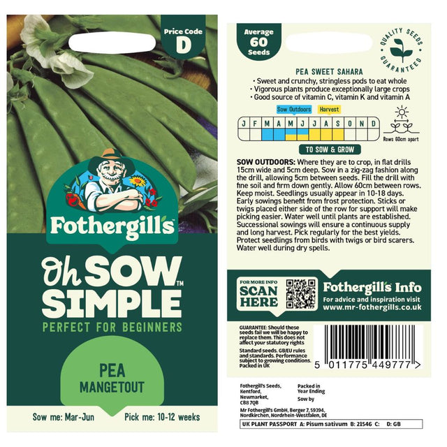 Fothergills Oh Sow Simple Mangetout Pea is the perfect choice for gardeners looking to grow a delicious, healthy crop with minimal effort. Whether you're a beginner or an experienced gardener, this variety will provide you with a high-yielding, fresh crop of sweet, crisp peas to enjoy all season long.