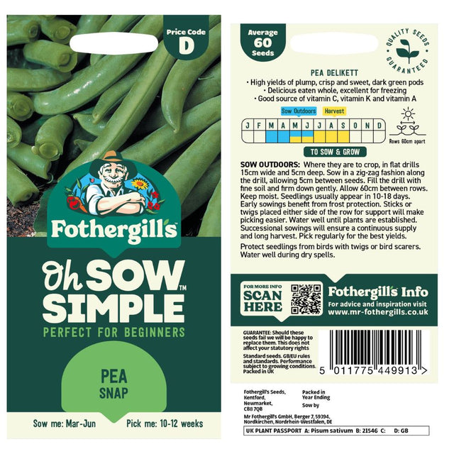 Fothergills Oh Sow Simple Pea Snap is a fantastic choice for gardeners looking for a fast-growing, high-yielding vegetable that is easy to grow and even easier to enjoy. Whether you're growing in a small garden, raised beds, or containers, this variety delivers a fresh, crisp harvest perfect for snacking, cooking, or adding to your favourite dishes.