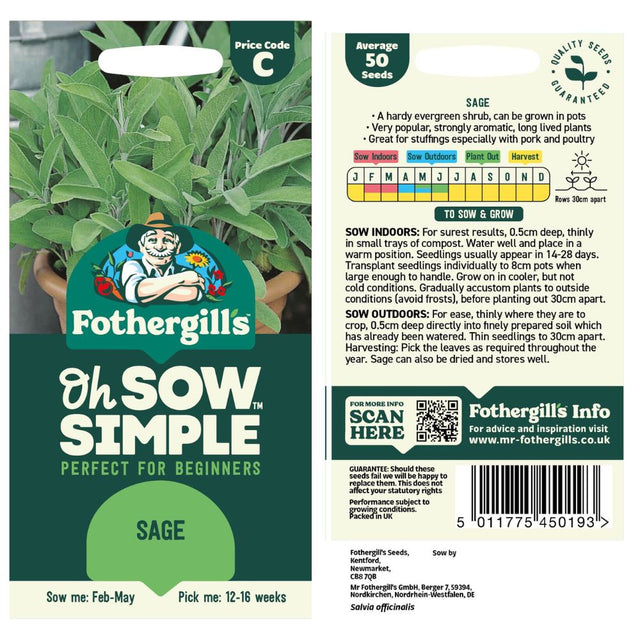 Fothergills Oh Sow Simple Sage is a must-have herb for any gardener, offering both culinary and ornamental appeal. Easy to grow and maintain, this versatile herb provides fresh leaves for seasoning, garnishing, or making herbal teas year after year.
