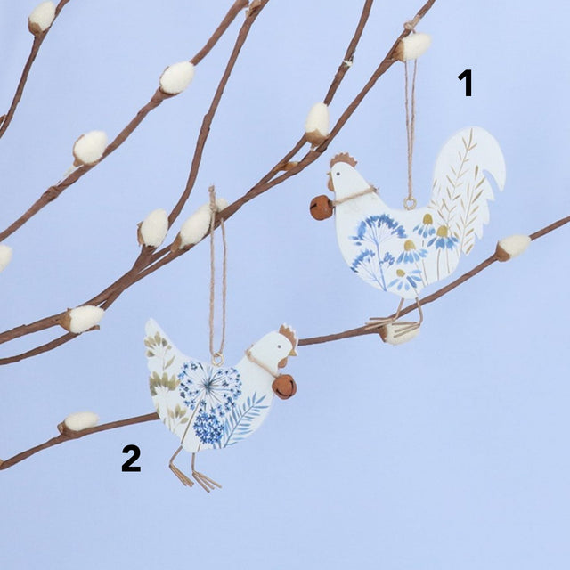 - Gorgeous hen and rooster hanging decorations with a blue meadow design