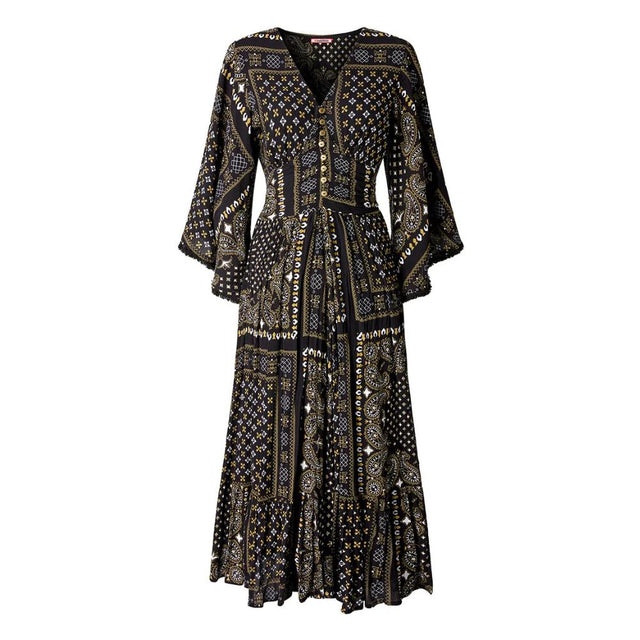 Make a statement this season with this women’s boho maxi dress that blends confidence, comfort and individuality. Crafted from lightweight woven fabric, it drapes beautifully to create a flattering silhouette, while the under-bust seams enhance your natural shape. The dramatic kimono sleeves add a touch of vintage-inspired glamour, perfectly balanced by the deep V neckline and subtle button detail. Whether you’re heading to a party, enjoying an evening out, or looking for a unique signature style, this dress promises effortless sophistication. Pair it with heeled boots or strappy sandals to complete the look.