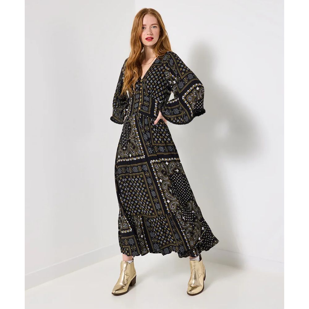 The Joe Browns Whimsical Wonders Floral Maxi Dress in black is a stunning V-neck maxi dress designed to turn heads. With its flowing kimono sleeves and striking bandana print, it’s the perfect choice for women who want effortless elegance with a touch of boho charm.