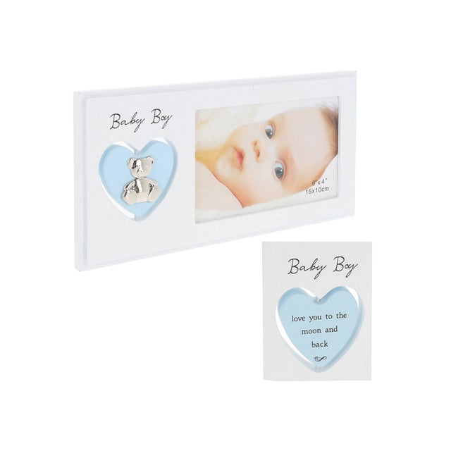 Celebrate the joy of a new arrival with the Spinning Heart Frame Baby Boy, a beautifully crafted keepsake designed to capture and cherish precious moments. This charming frame features a spinning heart design, with one side adorned with the heartfelt message, "I love you to the moon and back."