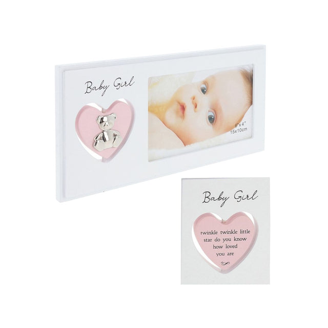 Celebrate the arrival of a precious baby girl with the Spinning Heart Frame Baby Girl. This beautifully crafted keepsake features a unique spinning heart design, perfect for capturing and cherishing the most special moments. while one side is adorned with the touching message, "Twinkle twinkle little star, do you know how loved you are."