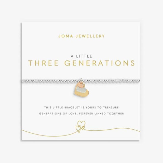 Celebrate the timeless connection between grandmother, mother, and daughter with the Joma Jewellery A Little 'Three Generations' Bracelet. This sentimental piece features three delicately interlinked silver-plated circles, each one representing a cherished generation within the family. Set on a softly elasticated silver-beaded bracelet, it offers a flexible fit for all wrist sizes and is designed for both comfort and everyday elegance. Presented on a meaningful sentiment card that reads, "These three little circles are joined in a line, to represent generations of love over time," it makes a perfect gift for birthdays, milestones, or just because. Thoughtfully designed in the UK, this bracelet is part of Joma’s bestselling ‘A Littles’ collection, known for combining delicate charm with lasting sentiment.