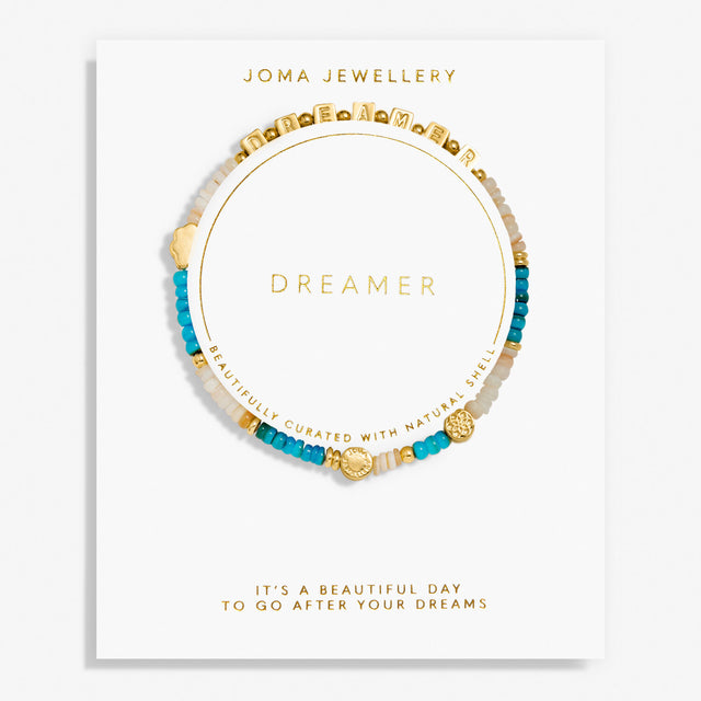 Radiate the best vibes all season long with the Happy Little Moments Collection! With multicoloured natural shells, alphabet beads, twinkling charms and coastal motifs, these stackable styles have been designed to celebrate special moments in the cutest way. Sitting pretty around a buttercream presentation card stamped with a golden sentiment, Joma's Happy Little Moments 'Dreamer' Bracelet In Gold Plating is the perfect little reminder that they can reach their dreams!
