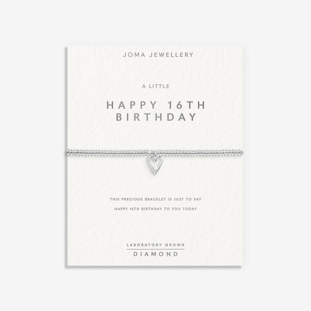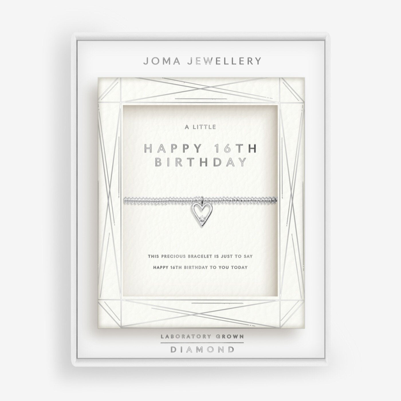 The Joma Jewellery Happy 16th Birthday Bracelet is a silver-plated milestone bracelet featuring a laboratory grown diamond, offering a luxurious and meaningful way to celebrate a 16th birthday.