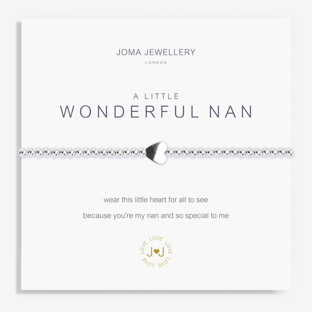 Show your Nan some love, and thank her for all she does for you with this adorable A Little ‘Wonderful Nan’ Bracelet. Timeless and completely giftable, this silver-plated stretch bracelet is designed to fit every wrist, and holds a solid silver-plated heart charm. Presented on a card that’s stamped with the sentiment and poem.