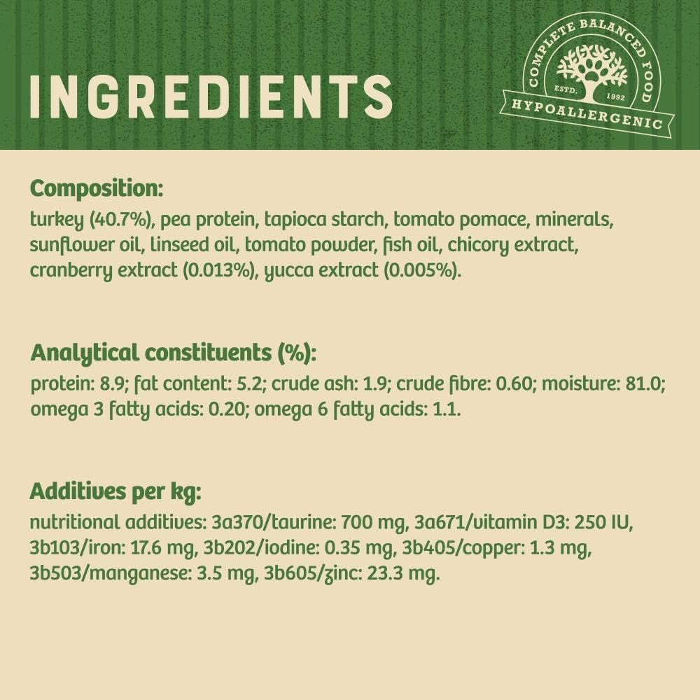 This specially formulated cat food is crafted using 100% natural turkey, providing a wholesome and irresistible taste for your feline friend. Infused with cranberry extract, it offers a rich source of antioxidants, promoting your cat's health from within. The inclusion of yucca extract helps in reducing litter tray odour, ensuring a fresher environment. Enriched with omega 3 & 6 oils and zinc, this formula contributes to maintaining a lustrous coat and healthy skin, supporting your cat's overall health and vitality.