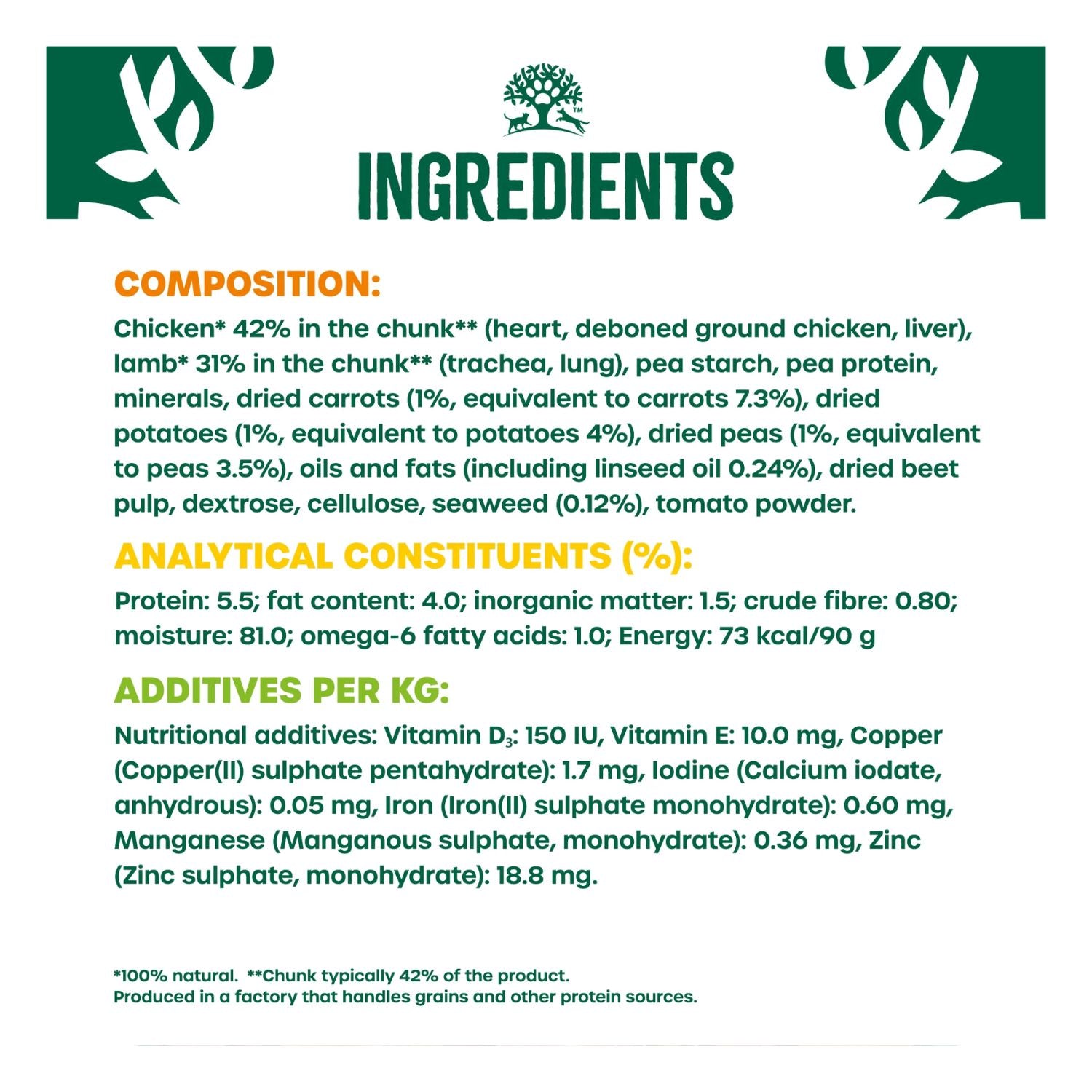 Ingredients: Lamb (minimum 26%), Chicken (minimum 24%), Vegetables (Peas, Carrots, Potatoes), Broth, Minerals, Sunflower Oil, Alfalfa, Seaweed, Chicory Extract, Yucca Extract, Rosemary Extract.