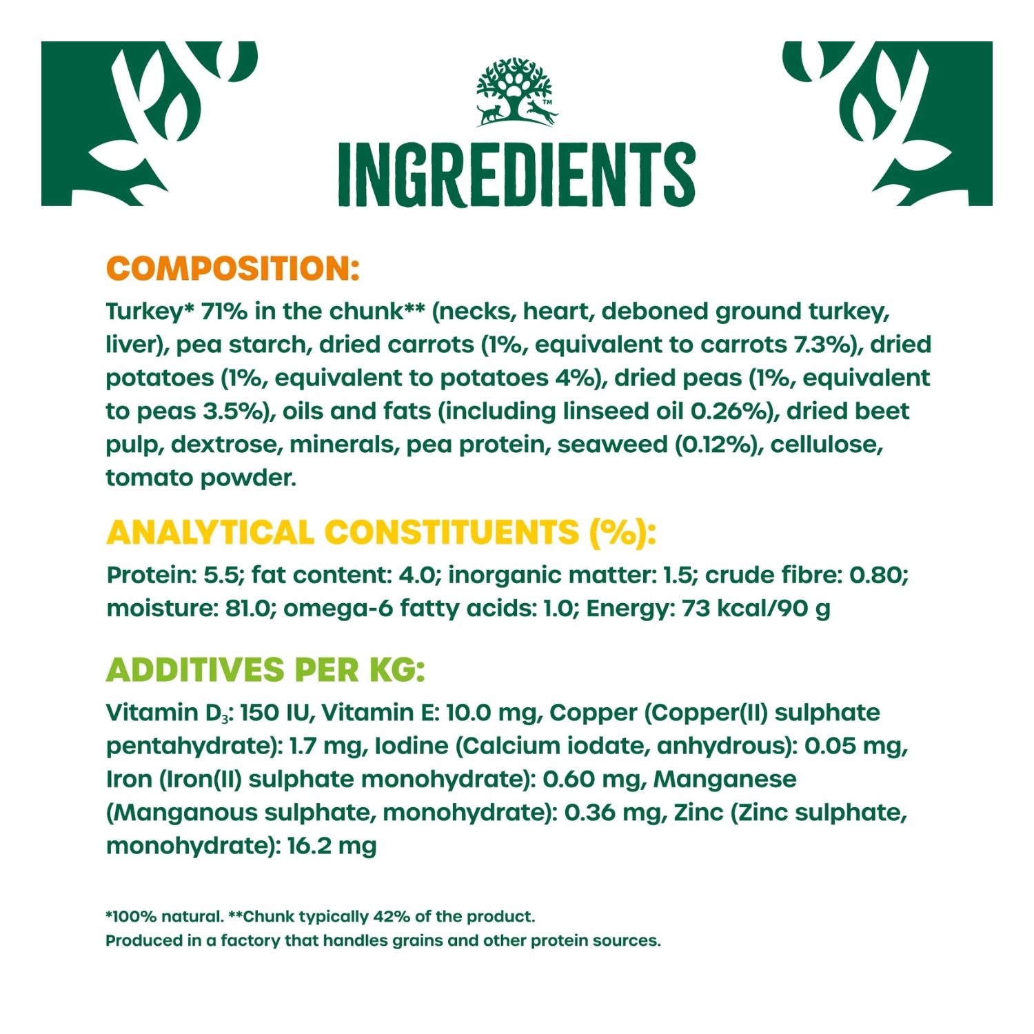 Ingredients: Turkey (minimum 40%), Peas, Carrots, Potato, Broth, Minerals, Sunflower Oil, Alfalfa, Seaweed, Chicory Extract, Yucca Extract, Rosemary Extract.