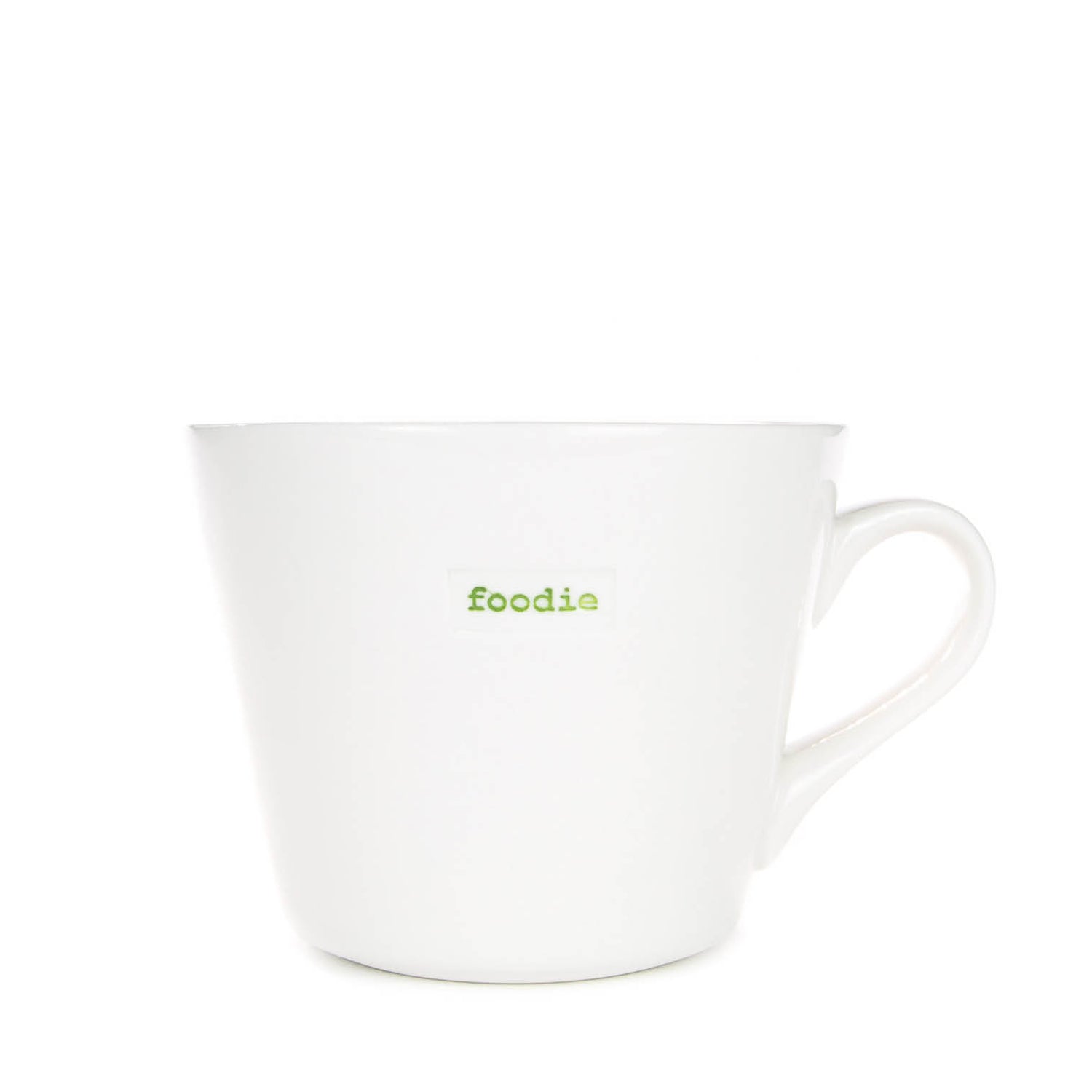 Introducing the Keith Brymer Jones bucket mug that's perfect for your foodie friend. Hand-stamped with the word "foodie" in a charming forest green vintage typewriter font, this mug adds character to your kitchen. Each mug has a capacity of 350ml's.