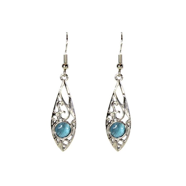 - Design: Elegant long oval earrings with a delicate Celtic motif, enhanced by a stunning light blue stone.