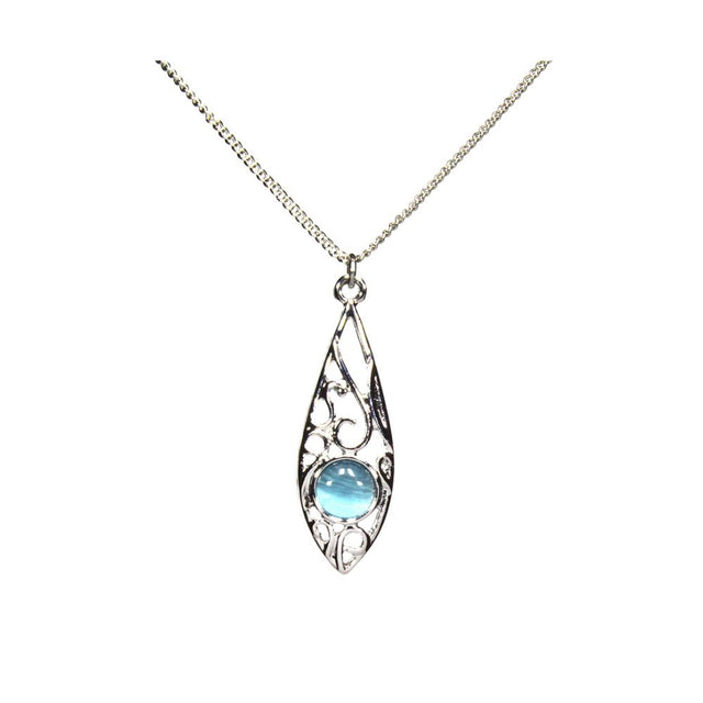 - Design: A graceful long oval pendant with a distinctive Celtic-inspired motif, adorned with a light blue stone for a touch of color and sophistication.