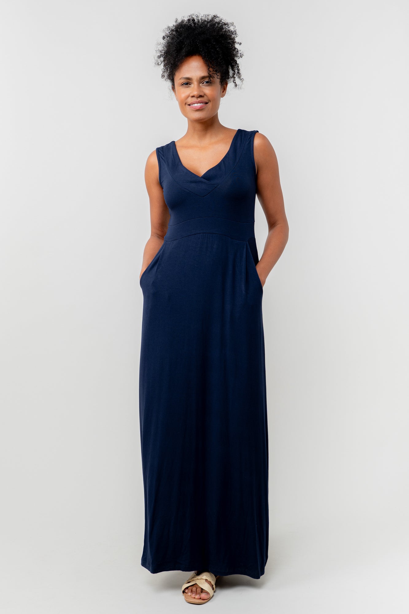 Lily & Me 14 Navy Plain Chrissy Maxi Dress is backordered and will ship as soon as it is back in stock.