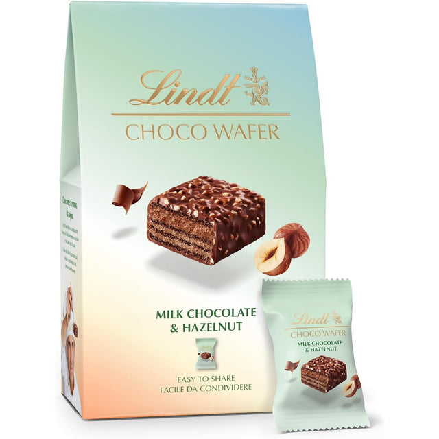 Lindt 135g Milk Chocolate & Hazelnuts Choco Wafer Sharing Box — a luxurious blend of creamy milk chocolate, crunchy hazelnuts, and crisp wafers, delivering an unforgettable chocolate experience perfect for sharing or gifting.