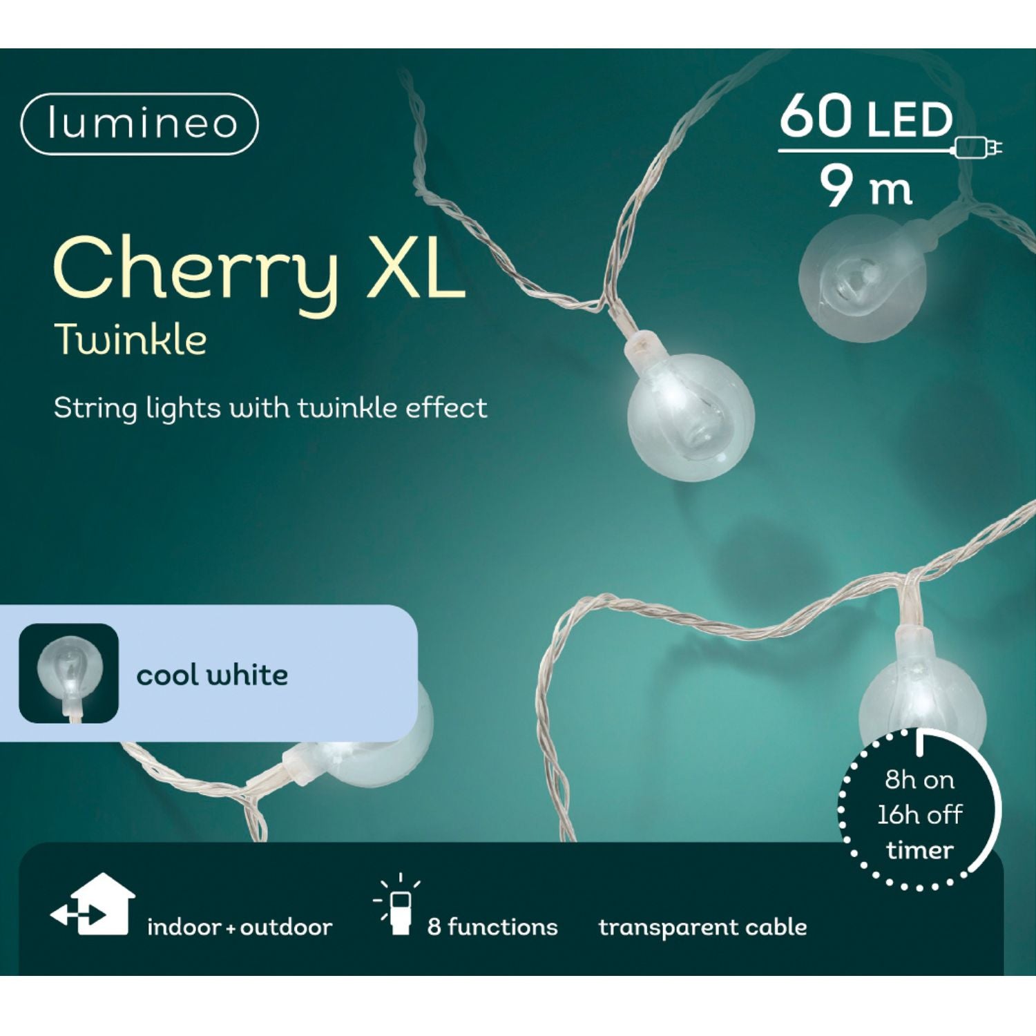 Illuminate your outdoor space with Lumineo's 9m Cool White Cherry LED Twinkle Effect Outdoor String Lights. With a length of 9m, these lights are perfect for adding a magical touch to your garden or patio. The cherry-shaped bulbs emit a cool white light, creating a charming twinkle effect.
