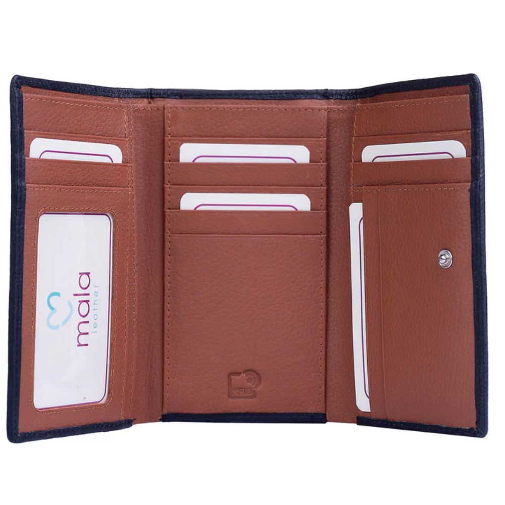 Meet your new favorite purse, the Mala Leather Black Best Friends Sitting Cat Tri Fold Purse – the ultimate combination of style and function. Crafted from luxury soft leather, this adorable purse features handstitched appliqué cat motifs that add a playful touch to its sleek black design.
