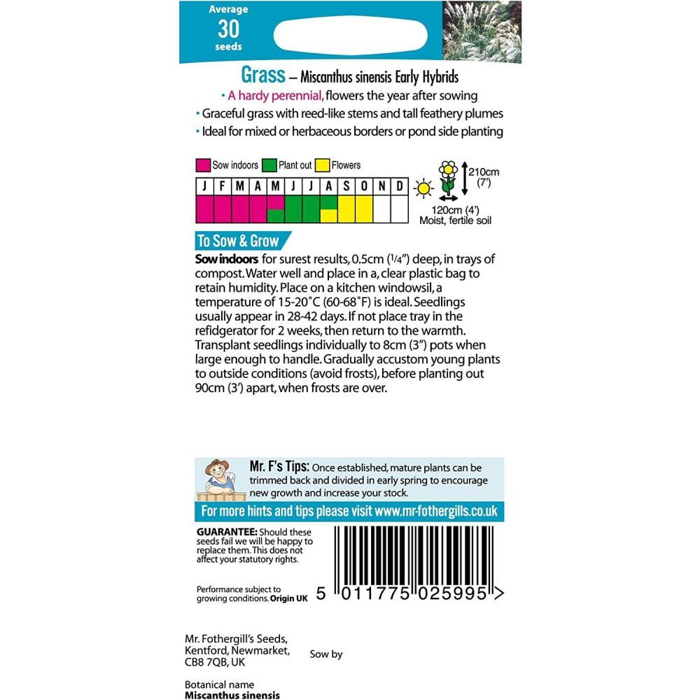Miscanthus Sinensis Grass Early Hybrids Seed by Mr. Fothergill's. Graceful feathery plumes. Graceful grass with reed-like stems and tall feathery plumes. Ideal for mixed or herbaceous borders or pond side planting. Flowers the year after sowing.