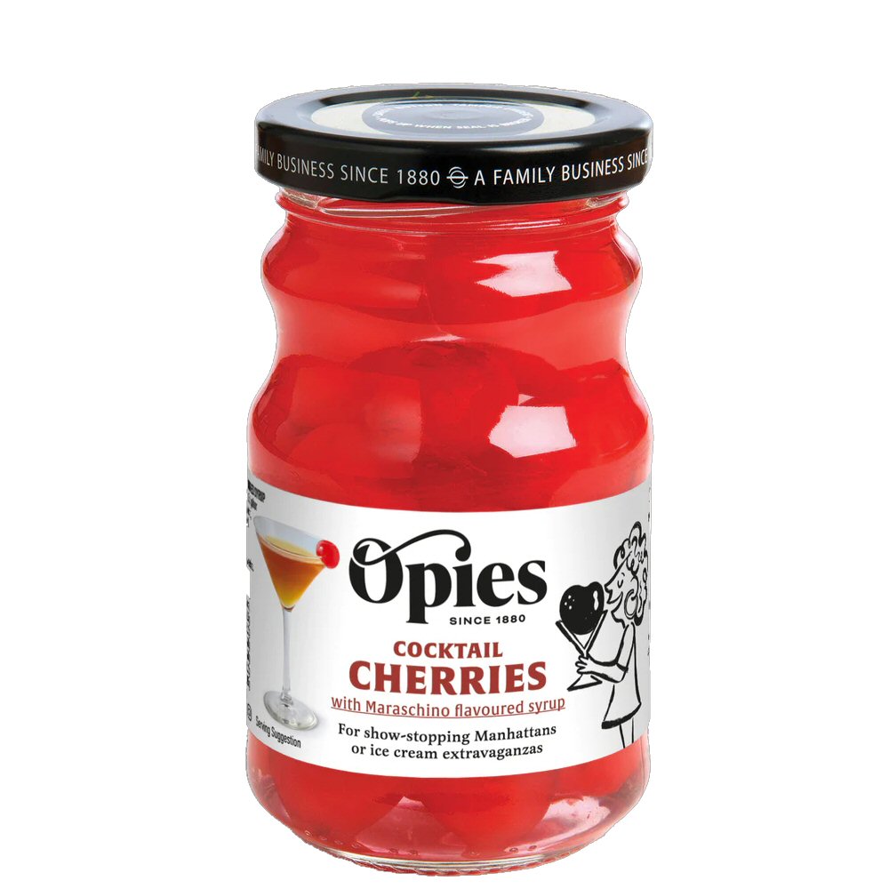 Opies Cocktail Cherries are vibrant, sweet cherries preserved in a maraschino-flavoured syrup, perfect for enhancing cocktails, desserts, and baking creations. Their bold colour and classic cherry-almond flavour make them a bar and pantry essential.