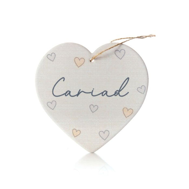 This Lovely Welsh Ceramic Heart decoration features the word "Cariad", meaning love, making it a perfect addition to any home or a thoughtful gift. Expertly crafted, this hanging heart adds a touch of love and beauty to any space. Made from high-quality ceramic, this decoration is durable and charming.