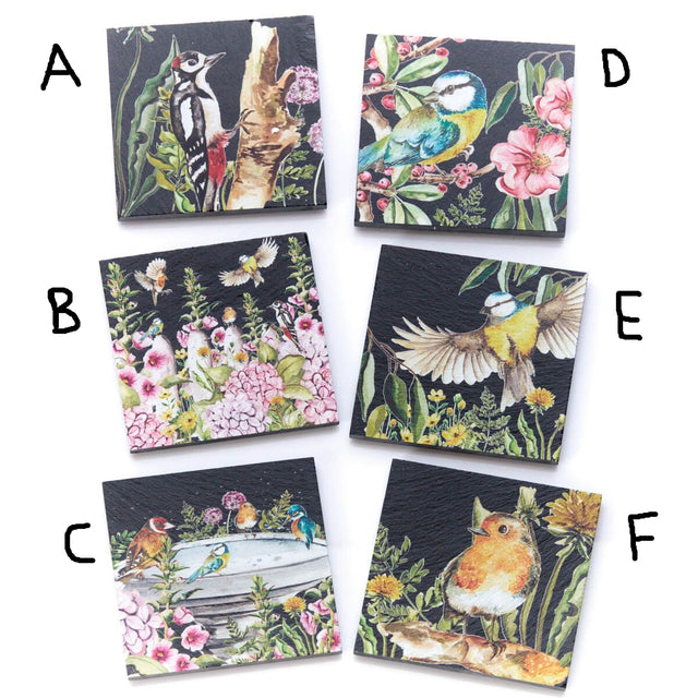 Elevate your home decor with Richard Langs' beautiful Floral Feathered Slate Bird Coasters. Crafted from stunning slate, each coaster features a unique design of birds surrounded by vibrant flowers. Keep your countertops clean in style with these elegant coasters. Choose from a selection of 6 designs.