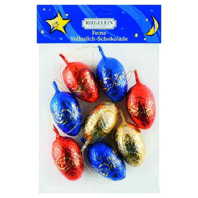 Decorate your tree in style with Riegelein Foiled Chocolate Cone Tree Decorations. Inside each pack, you’ll find 8 milk chocolate cones wrapped in festive foil — perfect for hanging on the tree, gifting, or enjoying during the holidays. The assortment includes red, blue, and gold foil designs (distribution may vary), making each pack unique. Combining delicious flavour with nostalgic presentation, these decorations bring both beauty and indulgence to your Christmas celebrations.