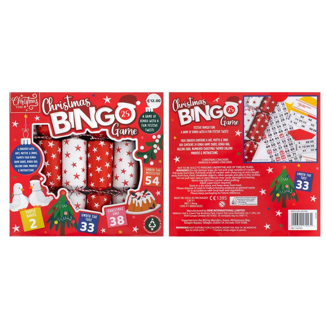 The RSW Christmas Bingo Crackers are a festive favourite, combining classic cracker traditions with an interactive family game. Each box contains six crackers decorated with contrasting red and white star designs and finished with coordinating ties for a cheerful festive look.Alongside the traditional hat, motto, and snap, this set comes with a complete bingo game – including 24 game cards, a calling card, number markers, a number bag, and instructions – making it the perfect after-dinner entertainment for family and friends. Designed with sustainability in mind, both the crackers and packaging are fully recyclable, and the set is free from plastic gifts, making it an environmentally friendly option for your celebrations.Specifications