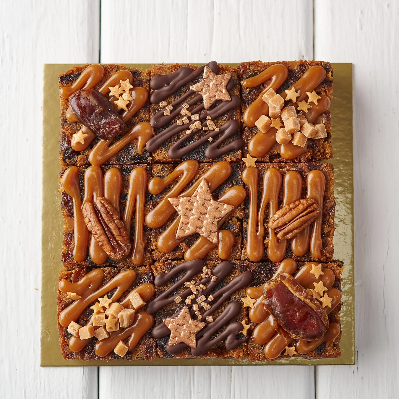 - Finish: Each cake is elegantly topped with drizzles of gooey caramel and Belgian chocolate, adorned with dates, fudge pieces, pecans, and sugar stars for a visual and taste sensation.