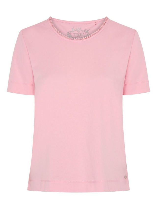A best-selling style returns in a stunning rose hue, perfect for the new season. This elegant top is designed with short sleeves and a delicately curated pearl beaded neck trim, adding a touch of sophistication. Crafted from soft poly-cotton jersey, it ensures both comfort and style throughout the season.