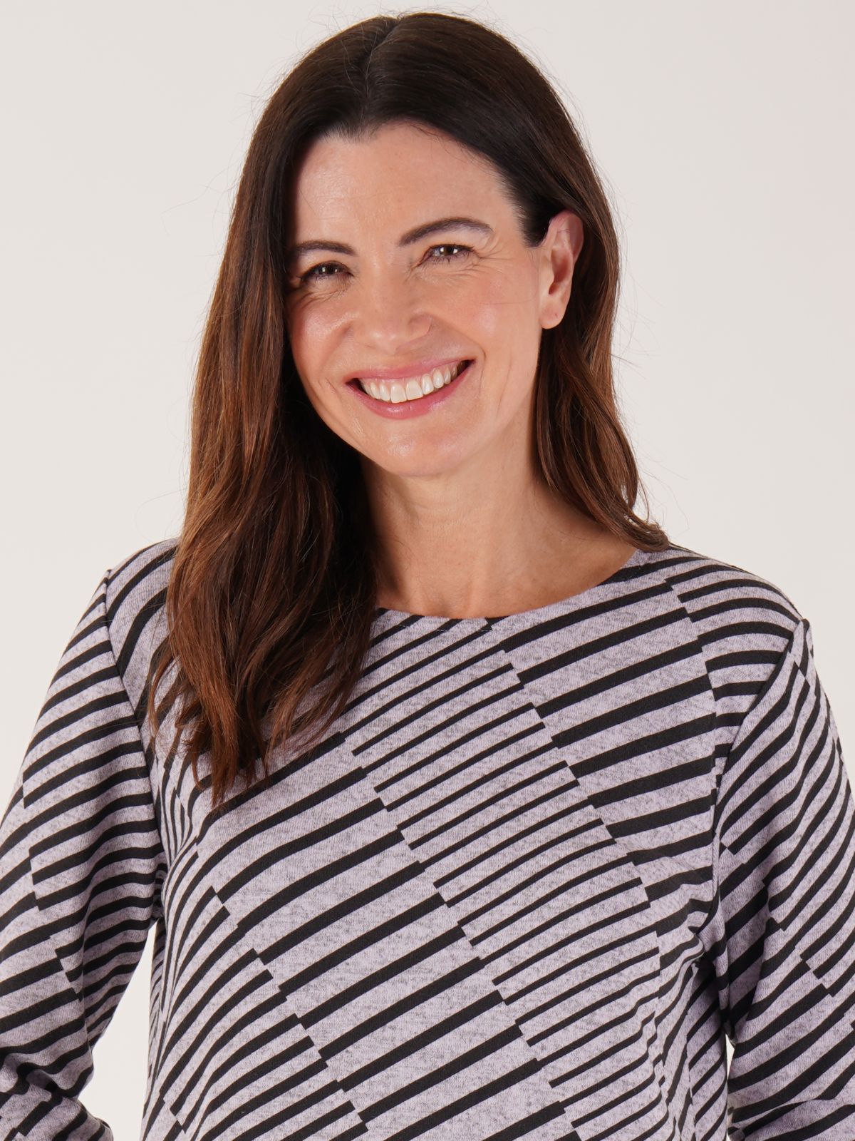 This diagonal lined print top in Lilac from Tigi Wear, features 3/4 length sleeves, high low hem finished with signature brand metal tab at the hem. Making it the perfect smart casual top, especially if paired with some nice jeans.