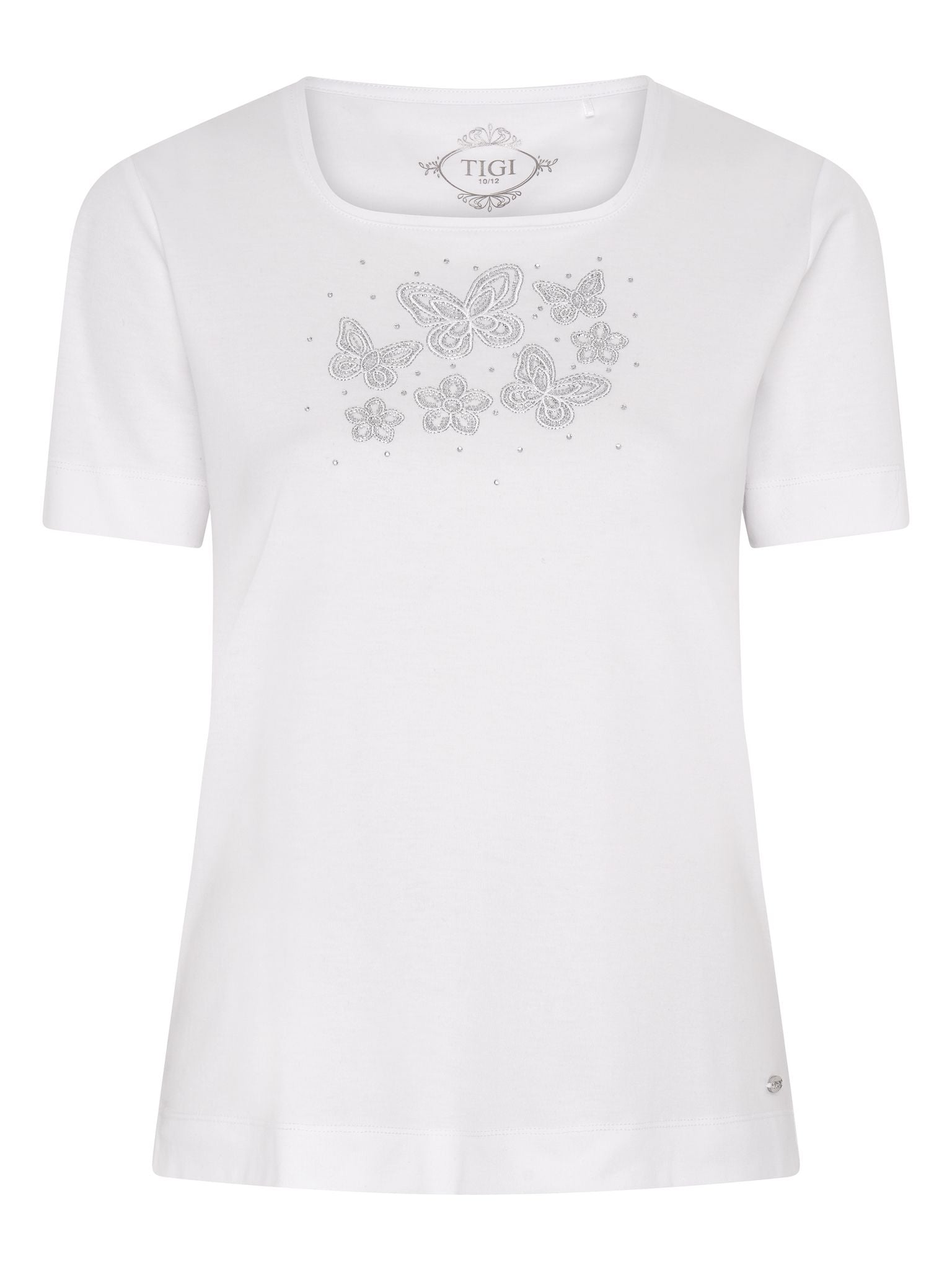TIGI 14/16 White Butterfly Floral Embellished Short Sleeved Top - T25-38D is backordered and will ship as soon as it is back in stock.