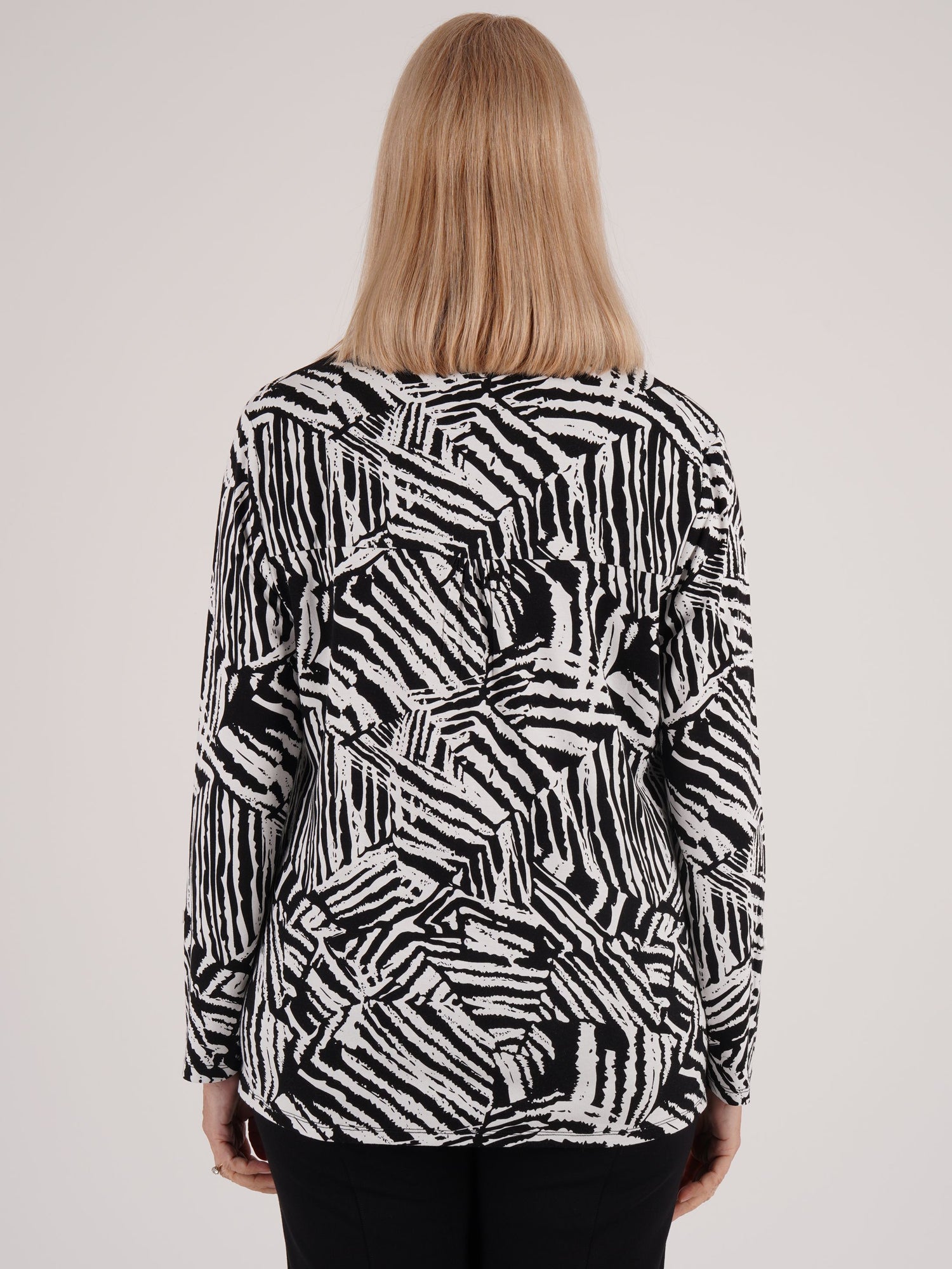 This abstract mono zebra print top blends modern style with effortless comfort. Crafted from soft viscose elastane jersey, it drapes beautifully in a flattering comfort fit. The notch neckline, mock placket front, and adjustable-length sleeves add a touch of sophistication, making this a versatile wardrobe essential.