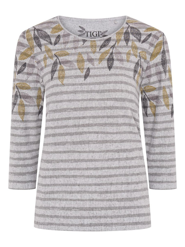 TIGI 18/20 Grey Leaf Print Stripe Round Neck Top - T25-07B