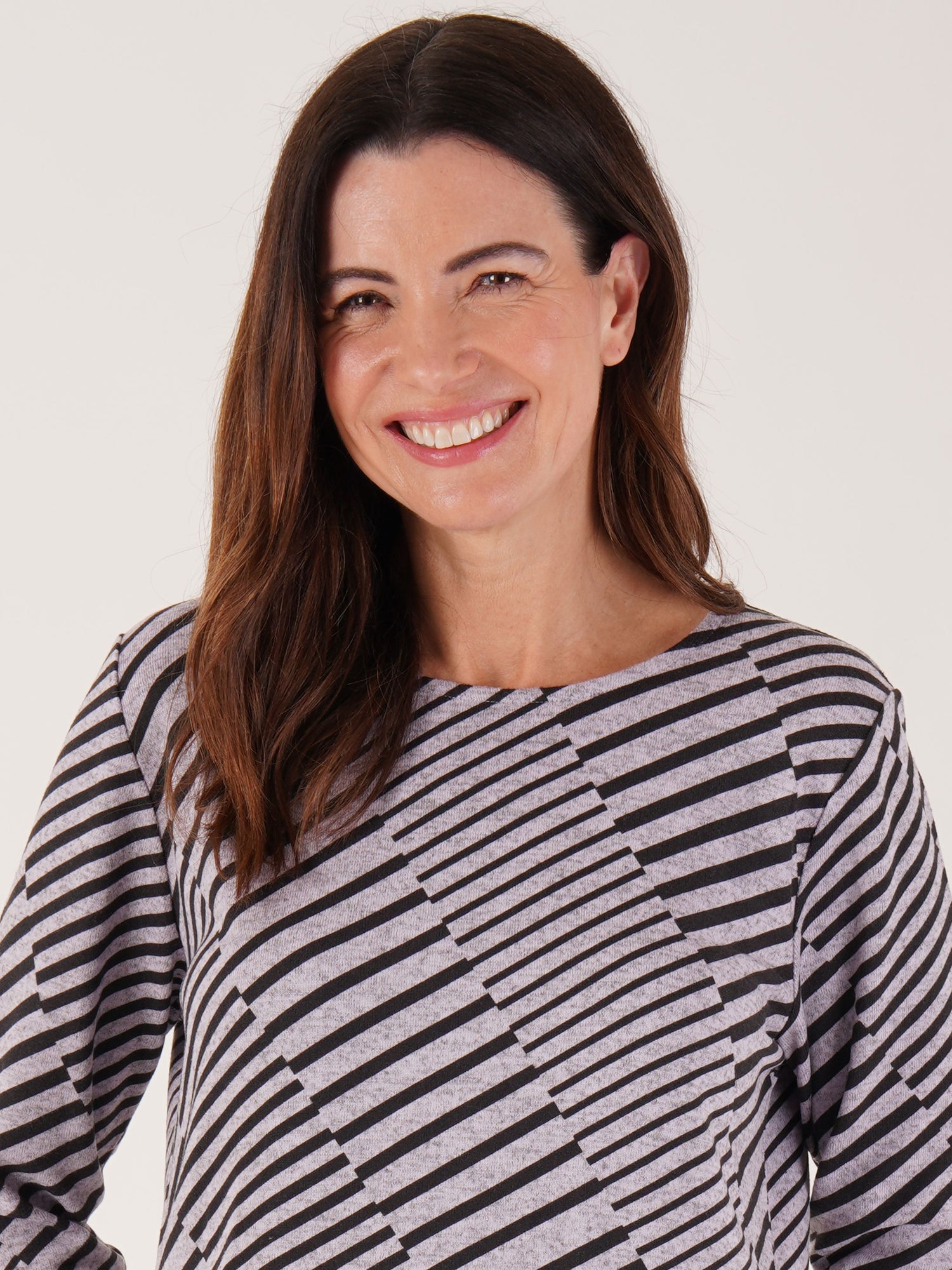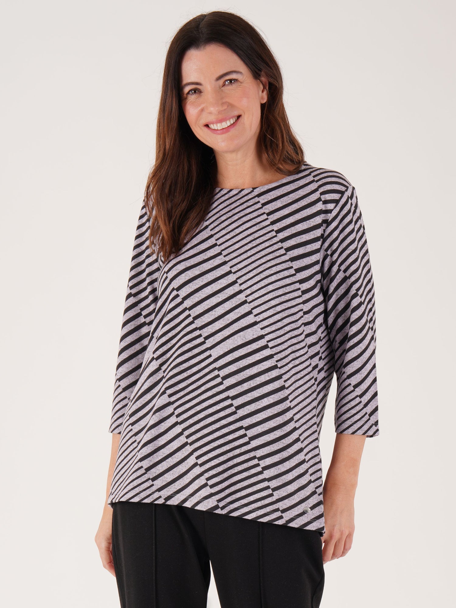 Add a soft splash of pattern to your wardrobe with our Lilac Diagonal Line Print Top. Designed for both comfort and elegance, this top is crafted from a soft viscose elastane jersey and cut in a flattering regular fit. The modern diagonal line print in gentle lilac tones adds a contemporary edge, while the notch neckline and 3/4 sleeves provide a stylish finish.