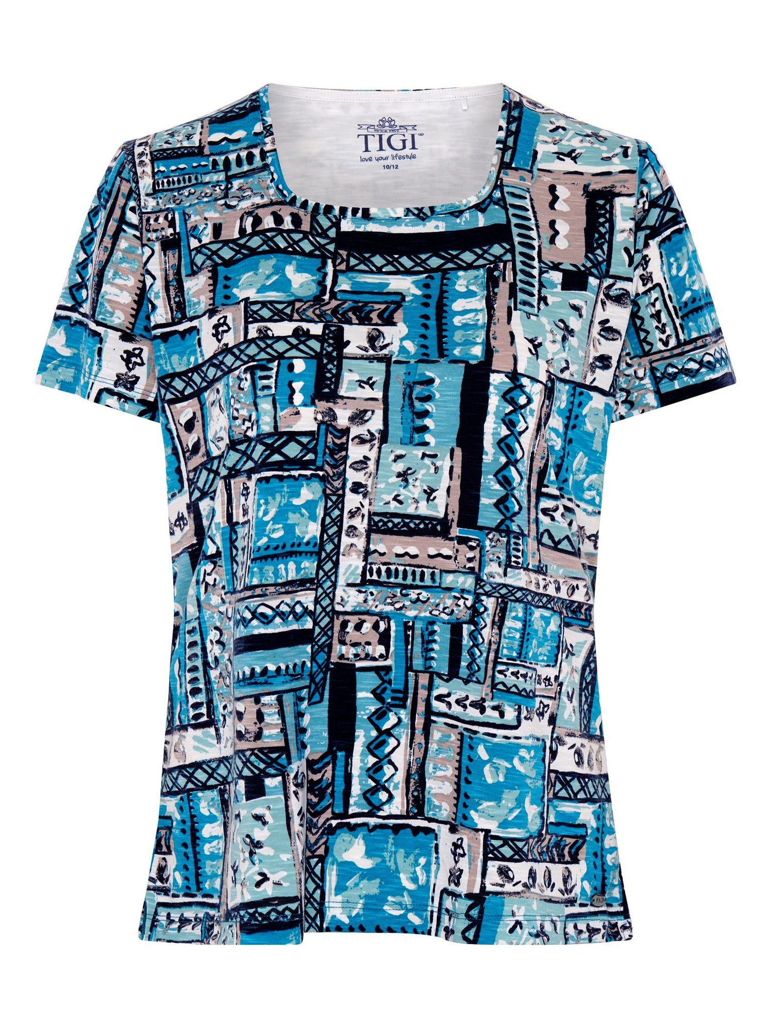 TIGI 22/24 Sea Green Square Neck Patchwork Print Top - T25-40B is backordered and will ship as soon as it is back in stock.