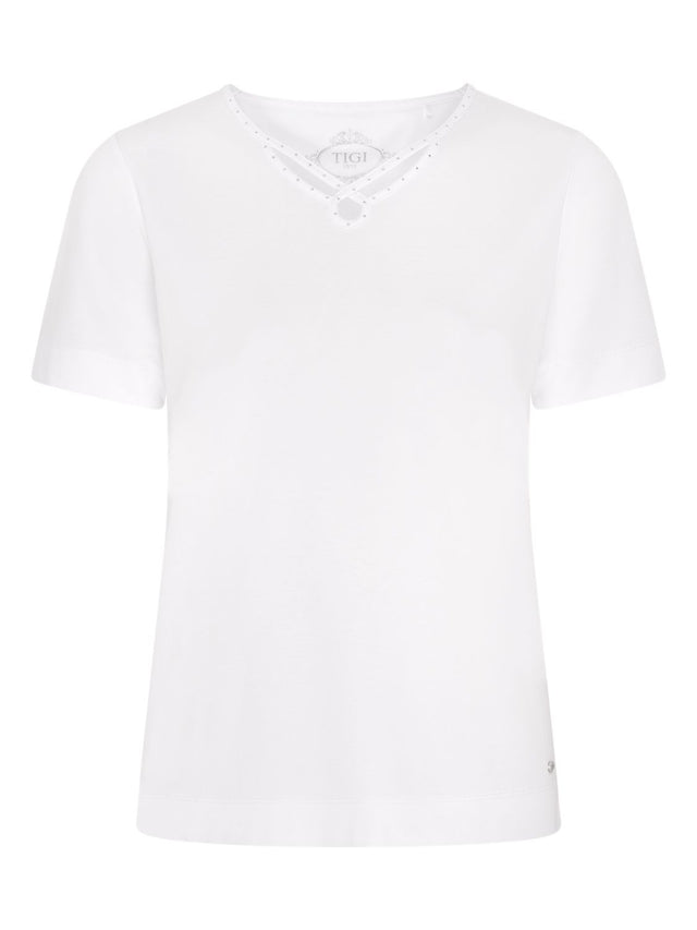 This versatile top is your new go-to for any occasion! Made from a soft cotton/poly blend jersey, it features a stunning embellished lattice keyhole front and short sleeves—combining elegance and comfort effortlessly. Pair it with your favorite trousers or skirt for a stylish outfit that’s perfect for both everyday wear and special events.
